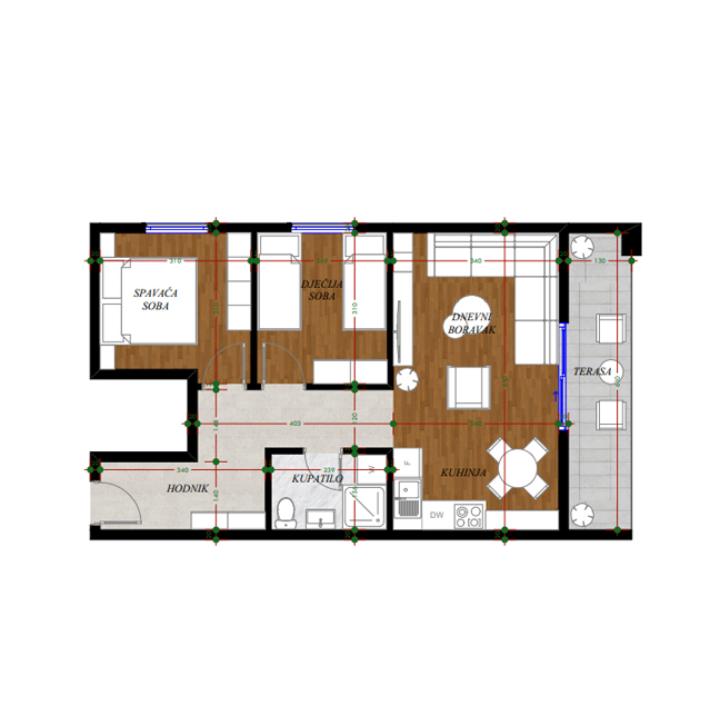 Opremljenost na 3D prikazima je predlog uredjenja. U cijenu stana nije uračunato opremanje i nameštanje sa prezentacije.