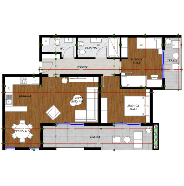 Opremljenost na 3D prikazima je predlog uredjenja. U cijenu stana nije uračunato opremanje i nameštanje sa prezentacije.