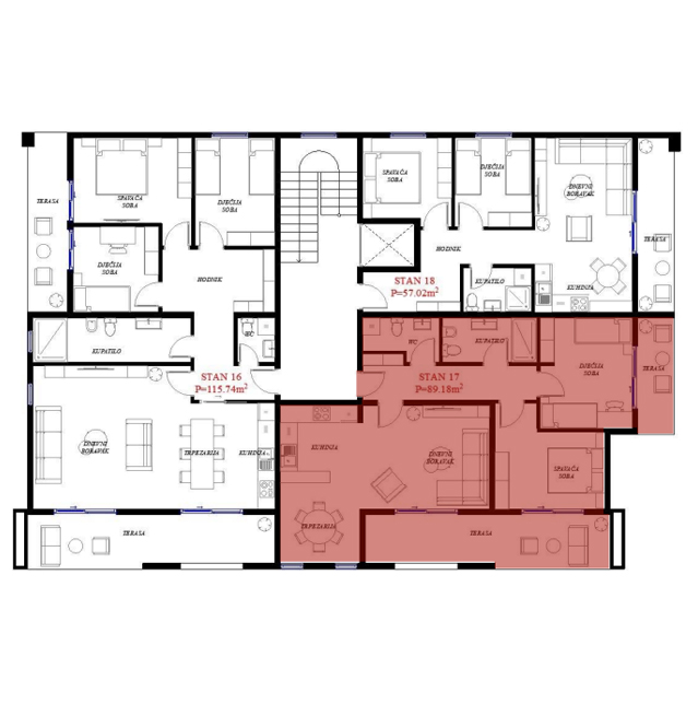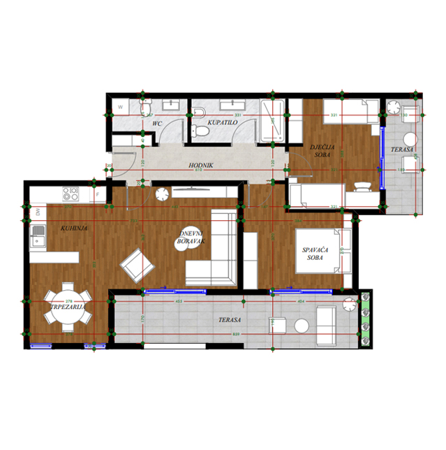 Opremljenost na 3D prikazima je predlog uredjenja. U cijenu stana nije uračunato opremanje i nameštanje sa prezentacije.