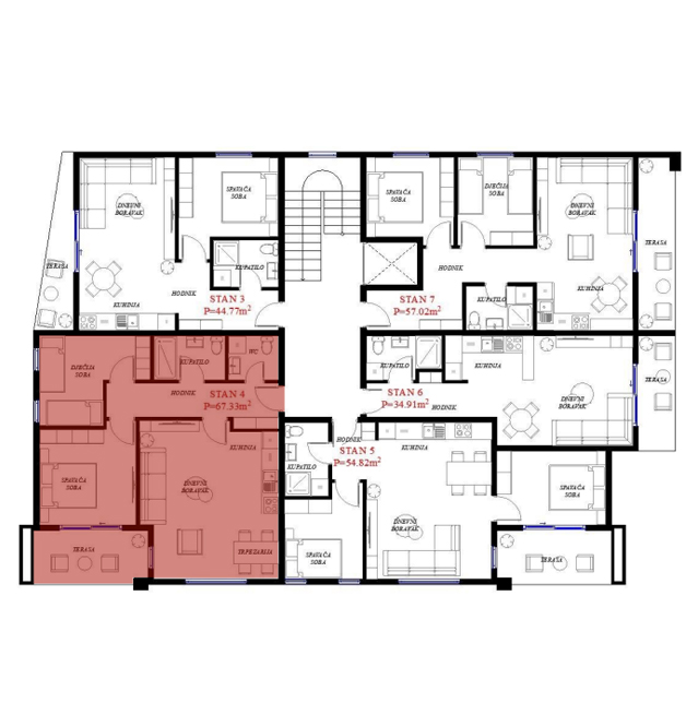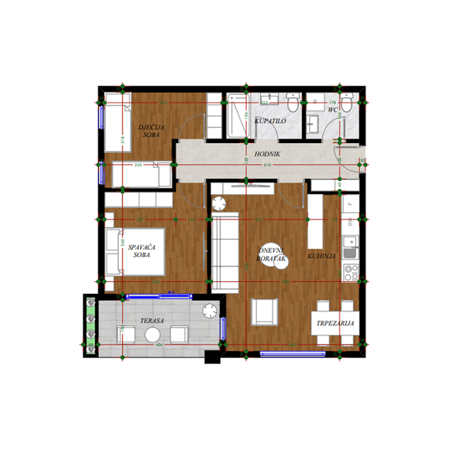 Opremljenost na 3D prikazima je predlog uredjenja. U cijenu stana nije uračunato opremanje i nameštanje sa prezentacije.