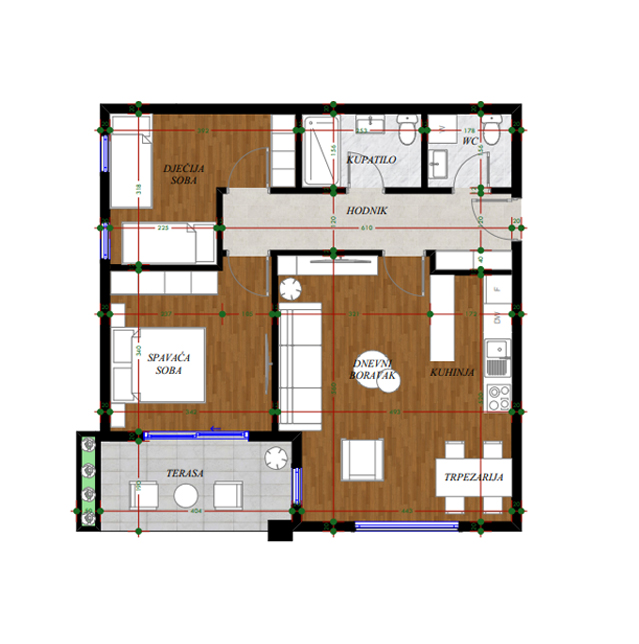 Opremljenost na 3D prikazima je predlog uredjenja. U cijenu stana nije uračunato opremanje i nameštanje sa prezentacije.