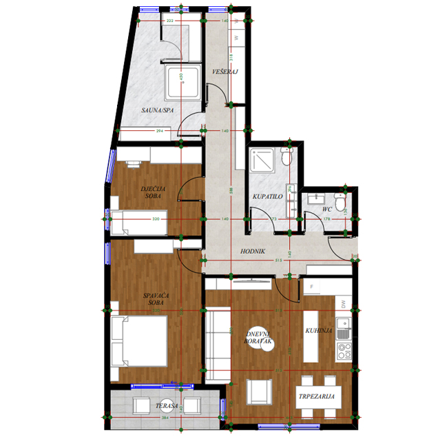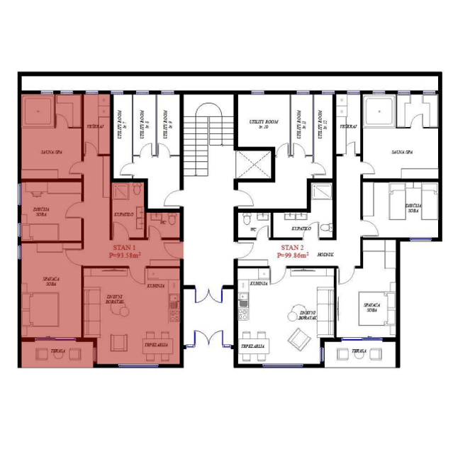 Opremljenost na 3D prikazima je predlog uredjenja. U cijenu stana nije uračunato opremanje i nameštanje sa prezentacije. Ovi stanovi imaju turska kupatila, sunu, kancelariju i sopstveno dvorište.