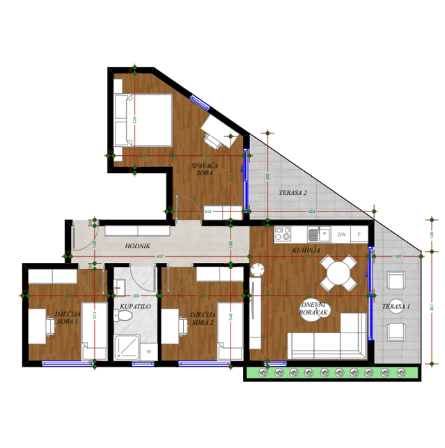 Opremljenost na 3D prikazima je predlog uredjenja. U cijenu stana nije uračunato opremanje i nameštanje sa prezentacije.